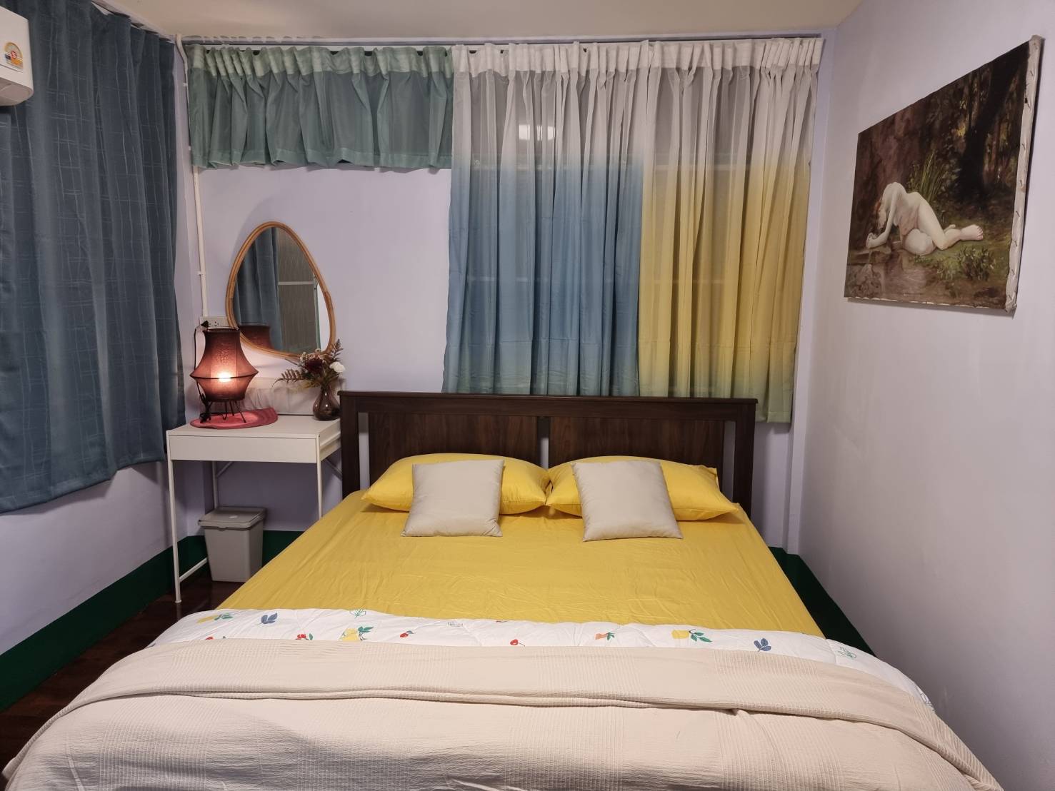 ห้องนอน 4 ห้องนอนแอร์บรรยากาศหวานสดใส ตกแต่งด้วยภาพนู๊ดสีน้ำมัน Re Production เตียง 6ฟุน ห้องน้ำรวมชั้น 2